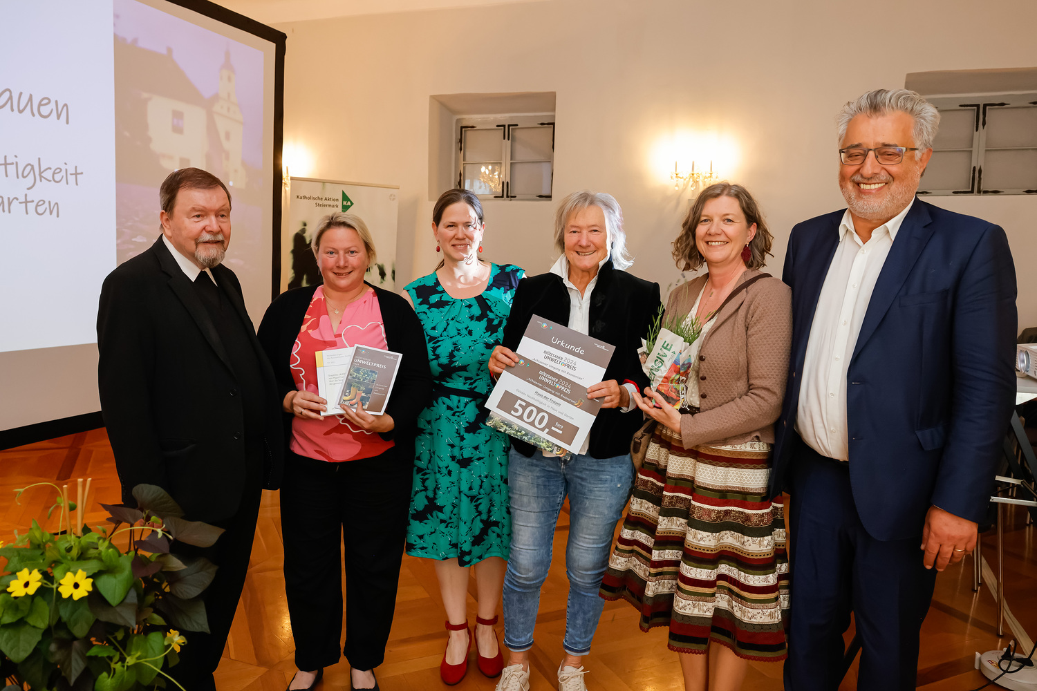 Bereits zum 16. Mal vergab der Arbeitskreis Nachhaltigkeit (AKN) der Katholischen Aktion (KA) den Diözesanen Umweltpreis, der in diesem Jahr unter dem Titel „Achtsamer Umgang mit Ressourcen“ stand. Die Bedeutung der Dankbarkeit gegenüber Gott und der Schöpfung strich Generalvikar Erich Linhardt in seinem Grußwort hervor. Er überreichte die Preise gemeinsam mit der Umweltbeauftragten Eva Heidlmair sowie mit Andreas Gjecaj, Präsident der KA-Steiermark, Martin Halmer, Ökonom der Diözese sowie Anna Kirchengast, Vorstandsmitglied des AKN. Anna Kirchengast stellte in ihrem Grußwort Bezüge zur vor 10 Jahren erschienen Enzyklika Laudato si‘, zur kürzlich durchgeführten Diözesankonferenz und den eingereichten Projekten her – sie alle sind Hoffnungszeichen für eine gute Zukunft.