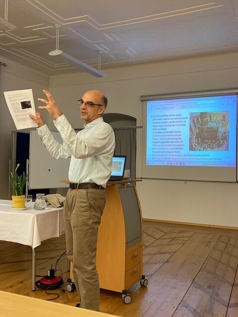 Dementsprechend groß war die Spannung unter den Teilnehmenden des Seminars am Mittwoch, 19.06.2024, – besonders auf das Neue in dem frisch im renommierten Herder-Verlag erschienenen Buch. Gleich vorweg betont der als durchaus kritisch denkend bekannte Theologe seine Intention: Er möchte den Menschen von heute „die Gestalt und Botschaft Jesu möglichst wortgetreu am biblischen Original, liebevoll und freimütig nahebringen“. Hervorgehoben wird von ihm – ein bemerkenswertes Novum, auch angeführt auf der Buchrückseite: „liebevoll“. Denn: „Streitigkeiten können wir uns in unserer Situation nicht leisten.“ In der aktuellen Kirchenkrise sieht Trummer aber zweifellos auch eine Chance, nämlich die einer Neubesinnung auf das Christliche, grundlegend Jesuanische, und weist auf die Bedeutung der Sprache hin. Diese hat gerade in Glaubensdingen für alle, besonders aber für ,Nicht-Insider‘, verständlich zu sein.