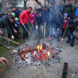 Hierfür wurde ein getrockneter Holzschwamm entweder auf einer Drahtschlinge befestigt oder in ein kleines passendes Metallgefäß gegeben. Dieser Schwamm wurde dann im Feuer vor der Kirche entzündet. Nach der Feuersegnung durch den Pfarrer eilten alle Anwesenden mit ihren rauchenden Schwämmen nach Hause. Dies soll die Bewohner und die Tiere vor Unwetter schützen! Ein schöner Brauch!