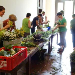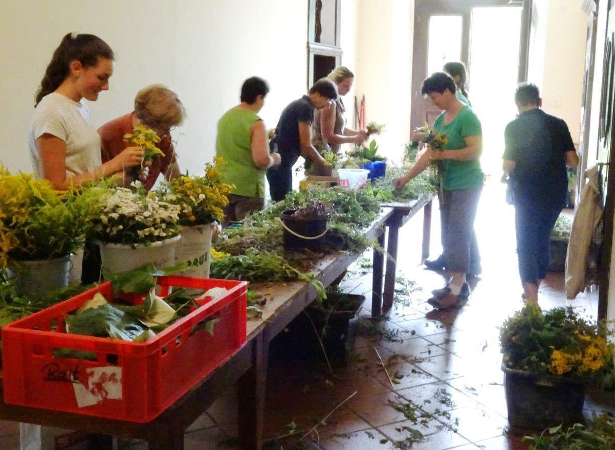 Kräuterbüschelbinden im Klostergang am 14. August 2018