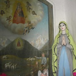 Das Sigl-Kreuz besteht aus einem stabilen Steinbau und ist mit einem Holzvordach und einem Schindeldach gedeckt, das 2005 von den Besitzern komplett erneuert werden musste. Im Inneren sieht man ein Bild vom „Ursprung des wunderbaren Gnadenbildes Maria Luschariberg“. Der Luschariberg befindet sich im österreichisch-italienischen Grenzgebiet unweit der Gemeinde Tarvis im Kanaltal. Maria Luschari ist heute ein berühmter europäischer Wallfahrtsort auf einem Aussichtspunkt, der einen herrlichen Blick auf die imposanten Berge der Gegend bietet und neben dem Pilgerweg auch durch eine Seilbahn erschlossen ist. Eine alte Überlieferung berichtet, dass dort im Jahr 1360 einem Hirt die Schafe weggelaufen waren. Kurz darauf fand er sie, kniend in einem Bergkieferstrauch. Verblüfft näherte er sich und sah im Strauch ein hölzernes, reliefartiges Bild der Gottesmutter mit dem Kind Jesu. Er brachte das Bild dem Pfarrer. Doch am nächsten Tag war das Bild auf wunderbare Weise wieder am Luschariberg, und wieder umgaben es kniende Schafe. Der Fall wiederholte sich noch ein drittes Mal. Da meldete der Pfarrer die Begebenheit dem zuständigen Patriarchen. Der gab die Anordnung, dass an der Stelle, wo das Bild gefunden wurde, eine Kapelle gebaut wird. An dieser Stelle, an der heute die Wallfahrtskirche thront, wird die heilige Maria als „Königin Europas“ verehrt.